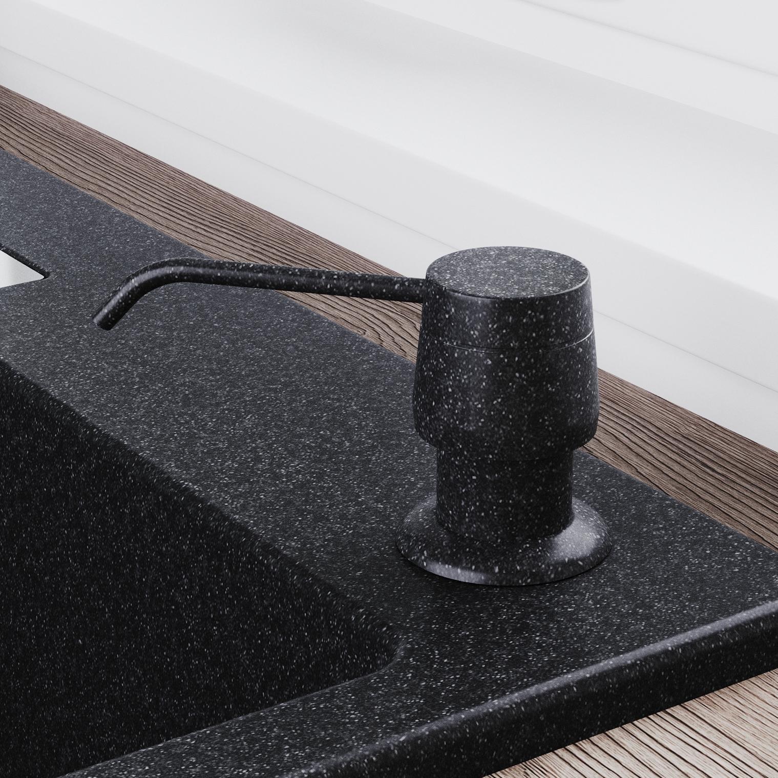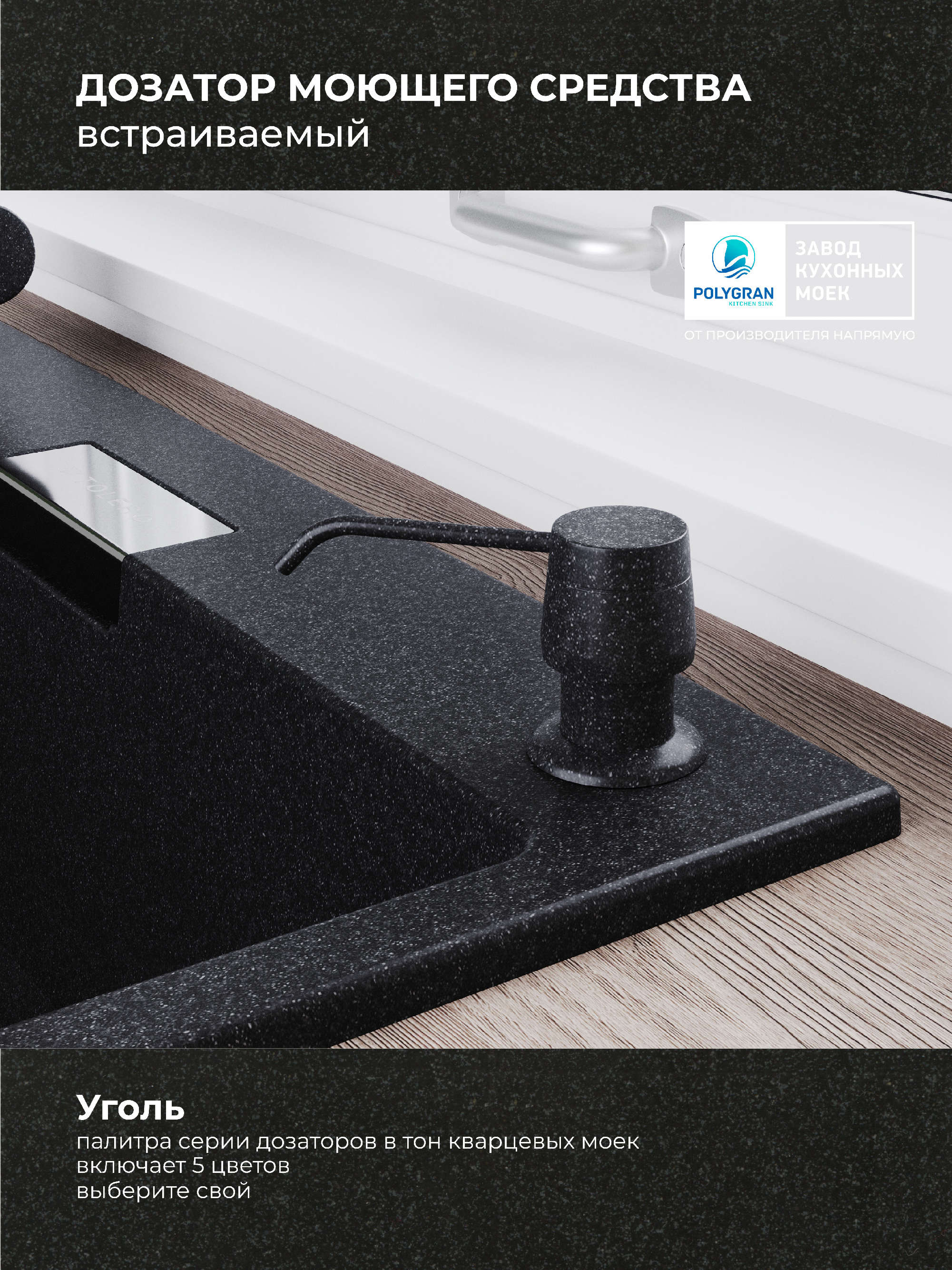 Встраивается в крыло мойки или в столешницу. Заполняется моющим средством.