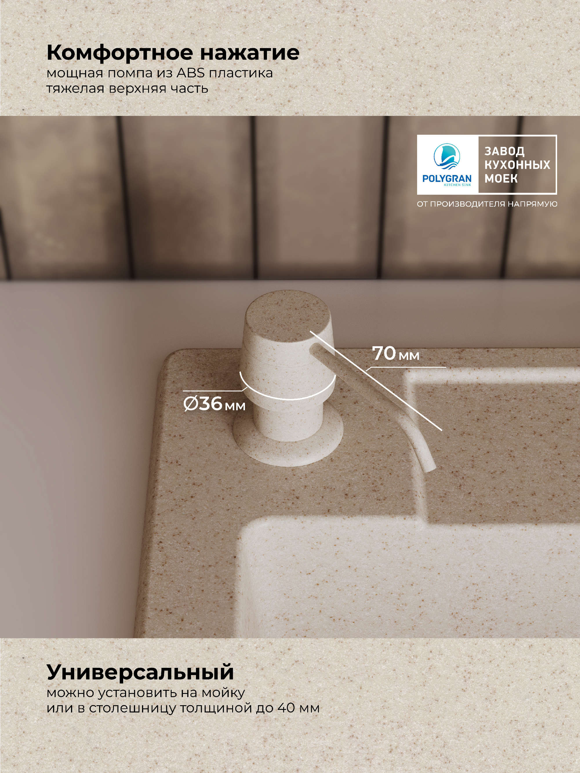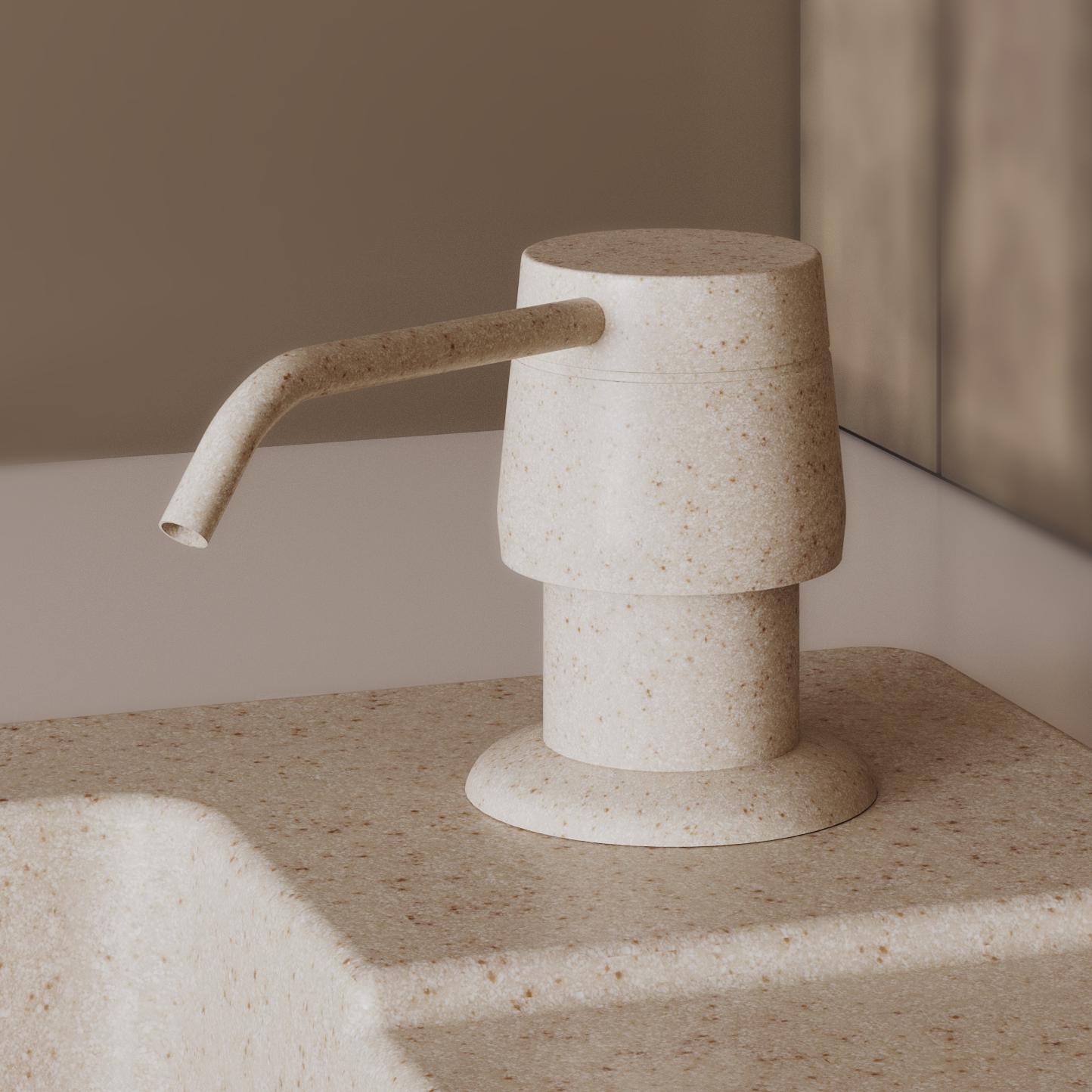 Встраивается в крыло мойки или в столешницу. Заполняется моющим средством.
