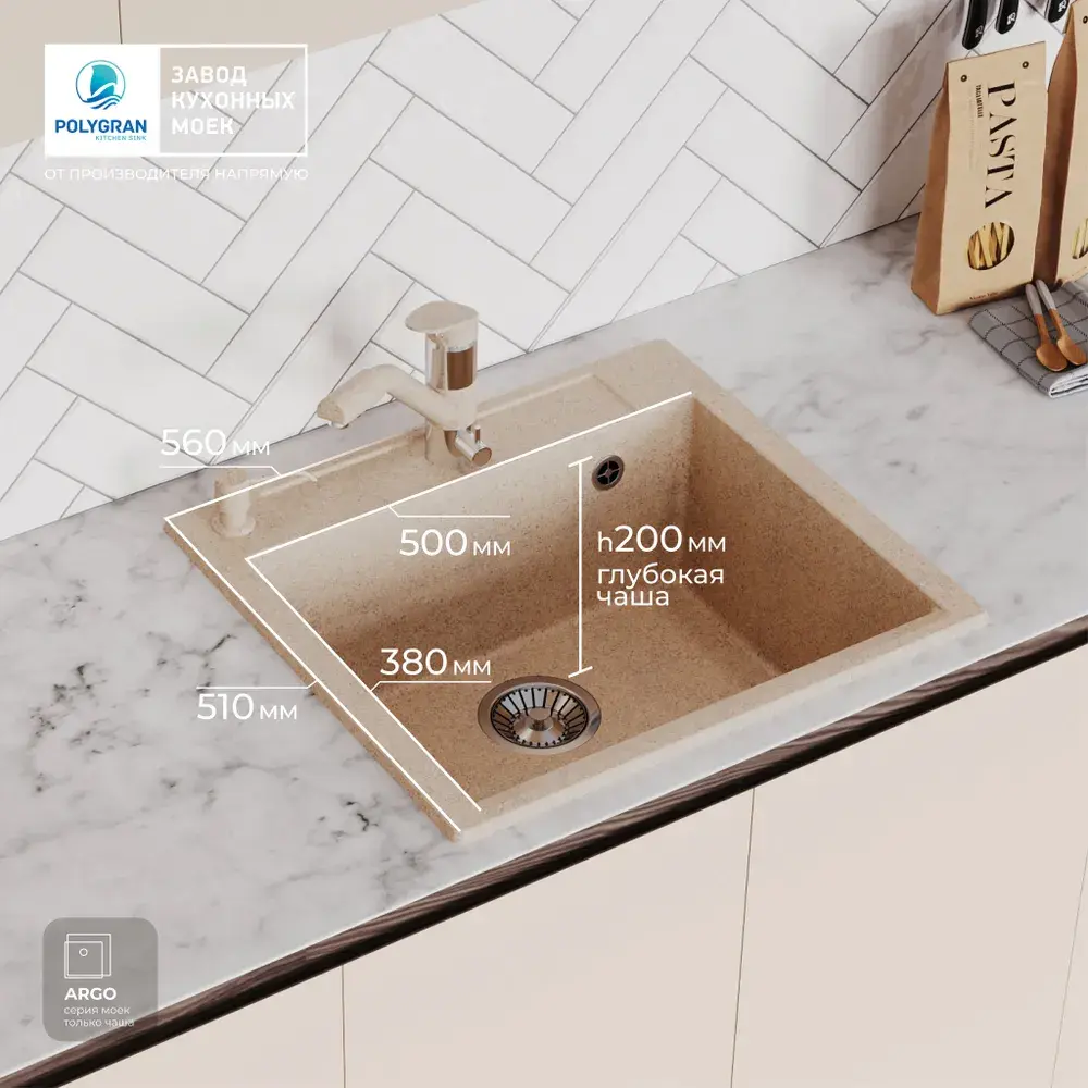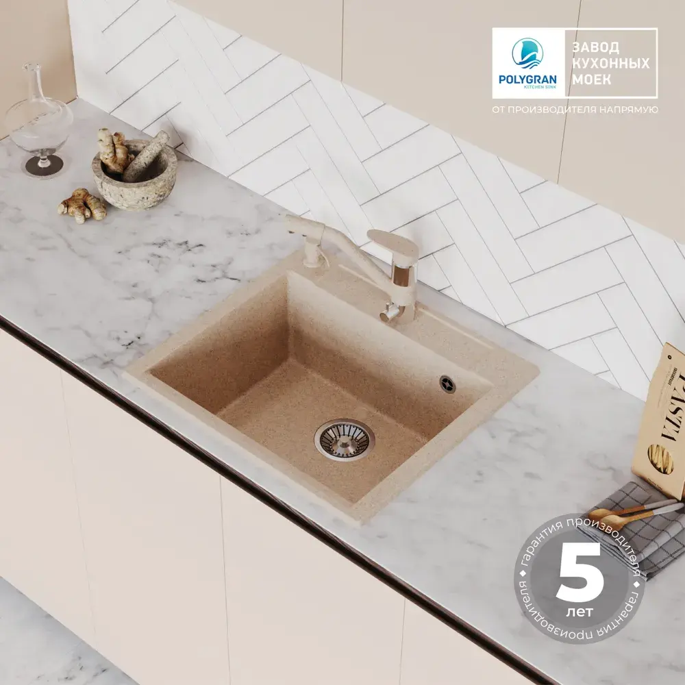 Мойка POLYGRAN ARGO-560 песочный №302, смеситель ДУО бежевый №27