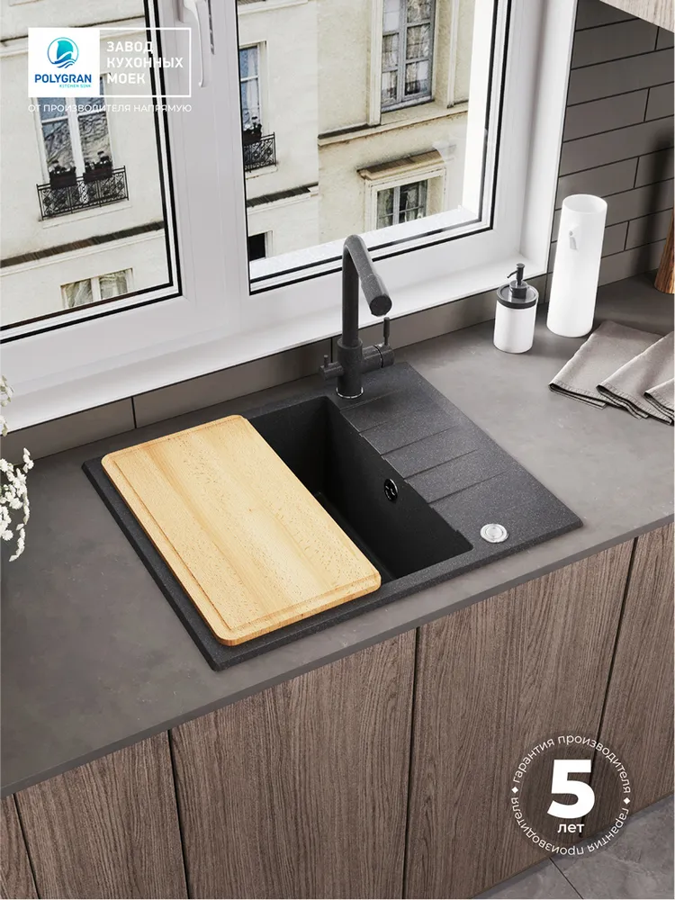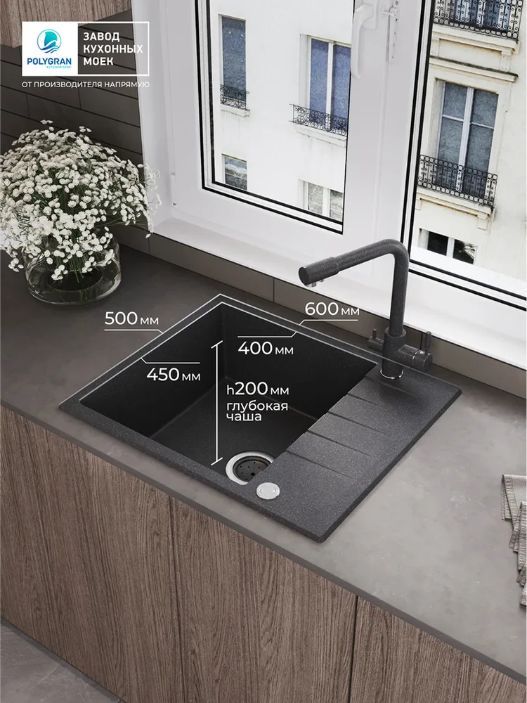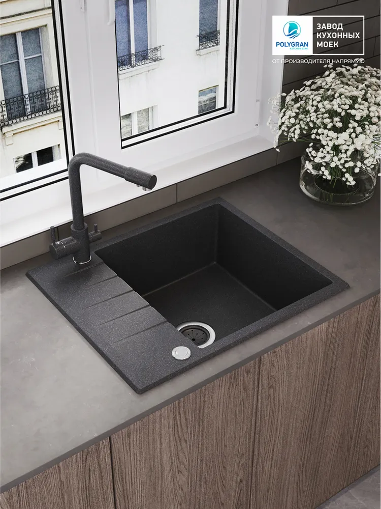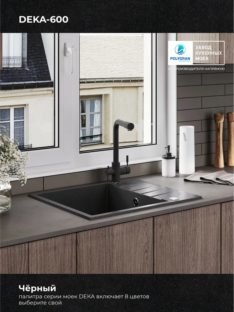 Мойка POLYGRAN DEKA-600 черный №16, смеситель DORADO черный