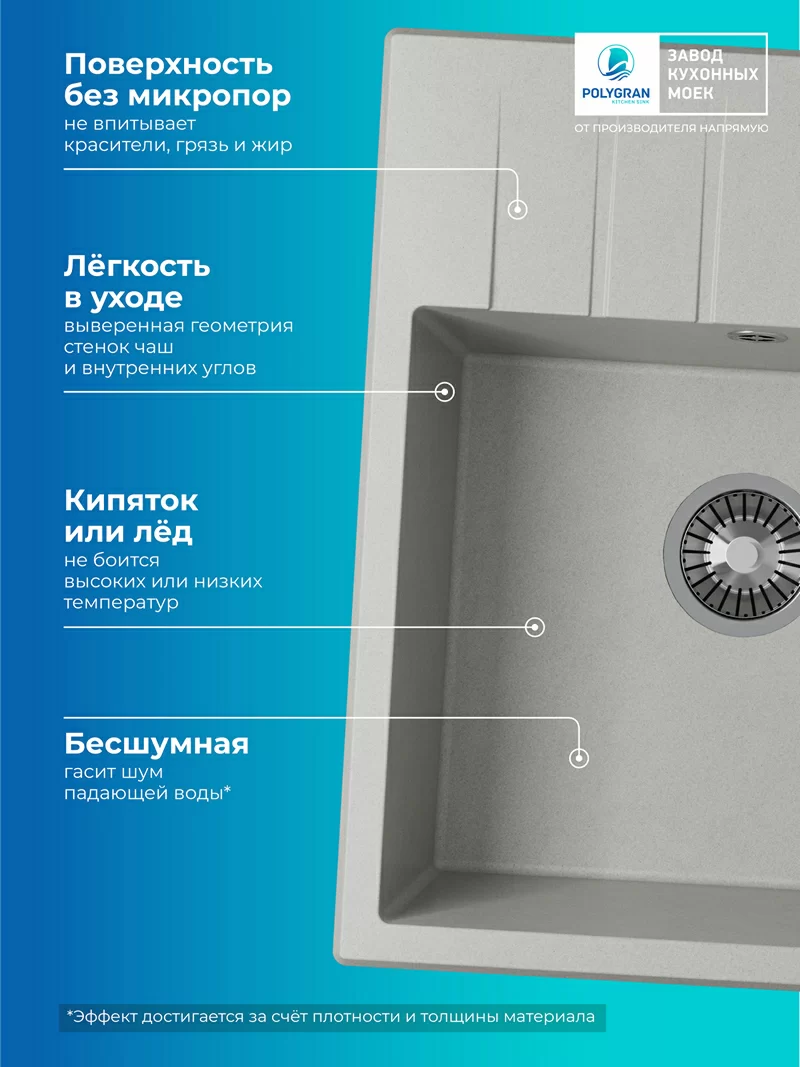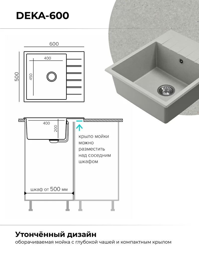 Мойка Deka 600 Polygran - прекрасно смотрится на современной кухне. Изготовлена из искусственного камня, что обуславливает бесшумность и долговечность. Ее глубина позволяет мыть габаритную посуду без брызг. Поверхность покрыта защитным покрытием Gelcoat, что делает ее непористой. На ней не остается жирного налета, она не впитывает неприятный запах. На широком оборачиваемом крыле предусмотрен канал для быстрого отведения стекающей воды. На обратной стороне намечены 2 отверстия для монтажа смесителя и аксессуаров.