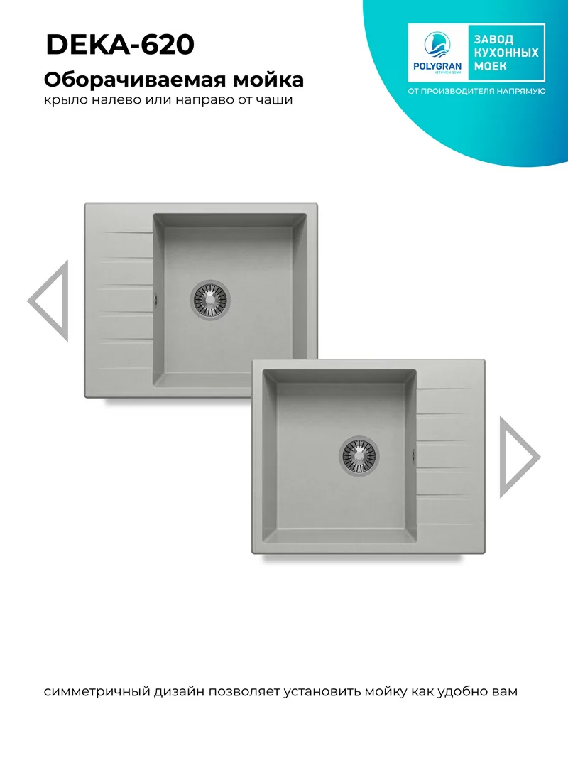 Особенности: Мойка из искусственного камня прочная, бесшумная и гигиеничная. Устойчива к высоким температурам и проста в уходе. Оборачиваемое крыло. Матовая поверхность.