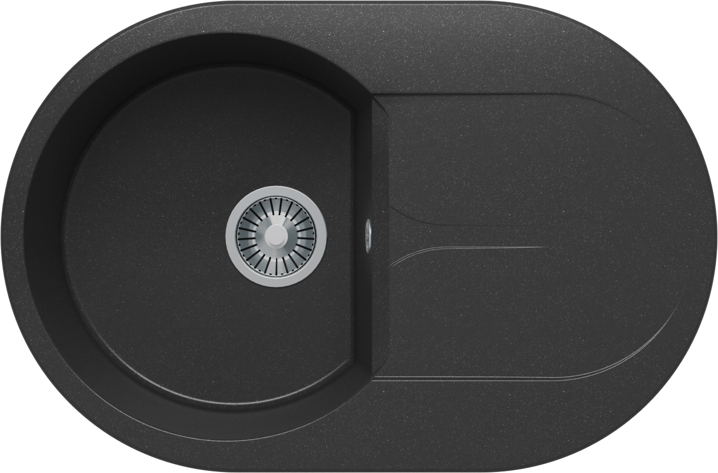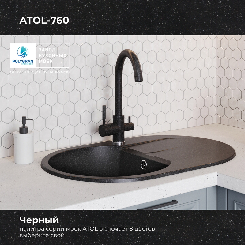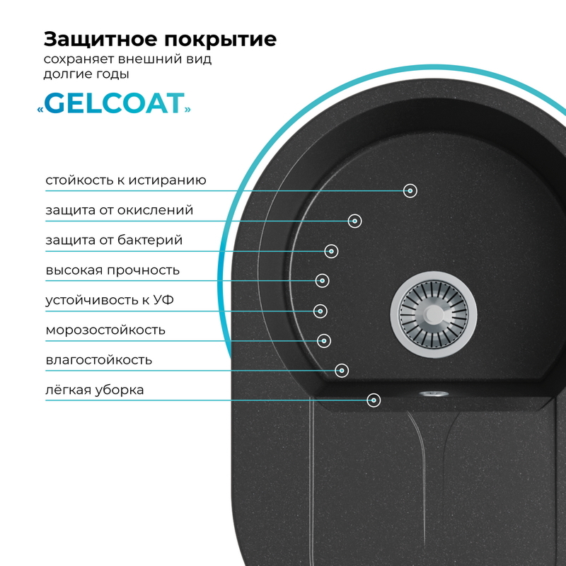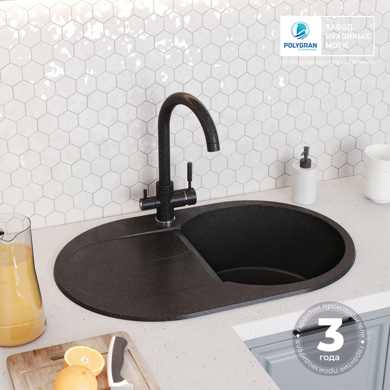 Не требует крепления к столешнице, благодаря собственному весу. Крепится в посадочное отверстие только на клей-герметик. Сливная арматура адаптирована к требованиям российской канализации. Размер выпускного отверстия составляет 3,5″ OKG, что идеально подходит для установки измельчителя пищевых отходов (диспоузера).
