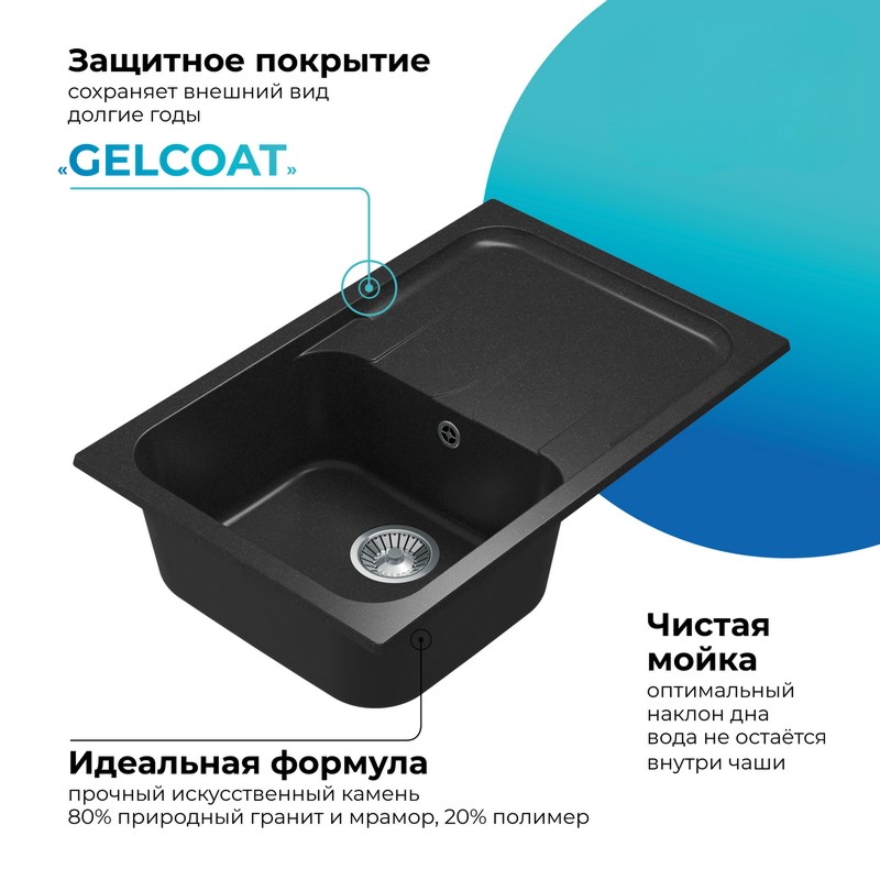 Возможность установки крыла слева или справа. В крыло мойки можно интегрировать кран фильтра для питьевой воды и дозатор моющих средств. Размер выпускного отверстия составляет 3,5″ OKG, что идеально подходит для установки измельчителя пищевых отходов (диспоузера). Не требует крепления к столешнице, благодаря собственному весу. Крепится в посадочное отверстие только на клей-герметик. Сливная арматура моек адаптирована к требованиям российской канализации.