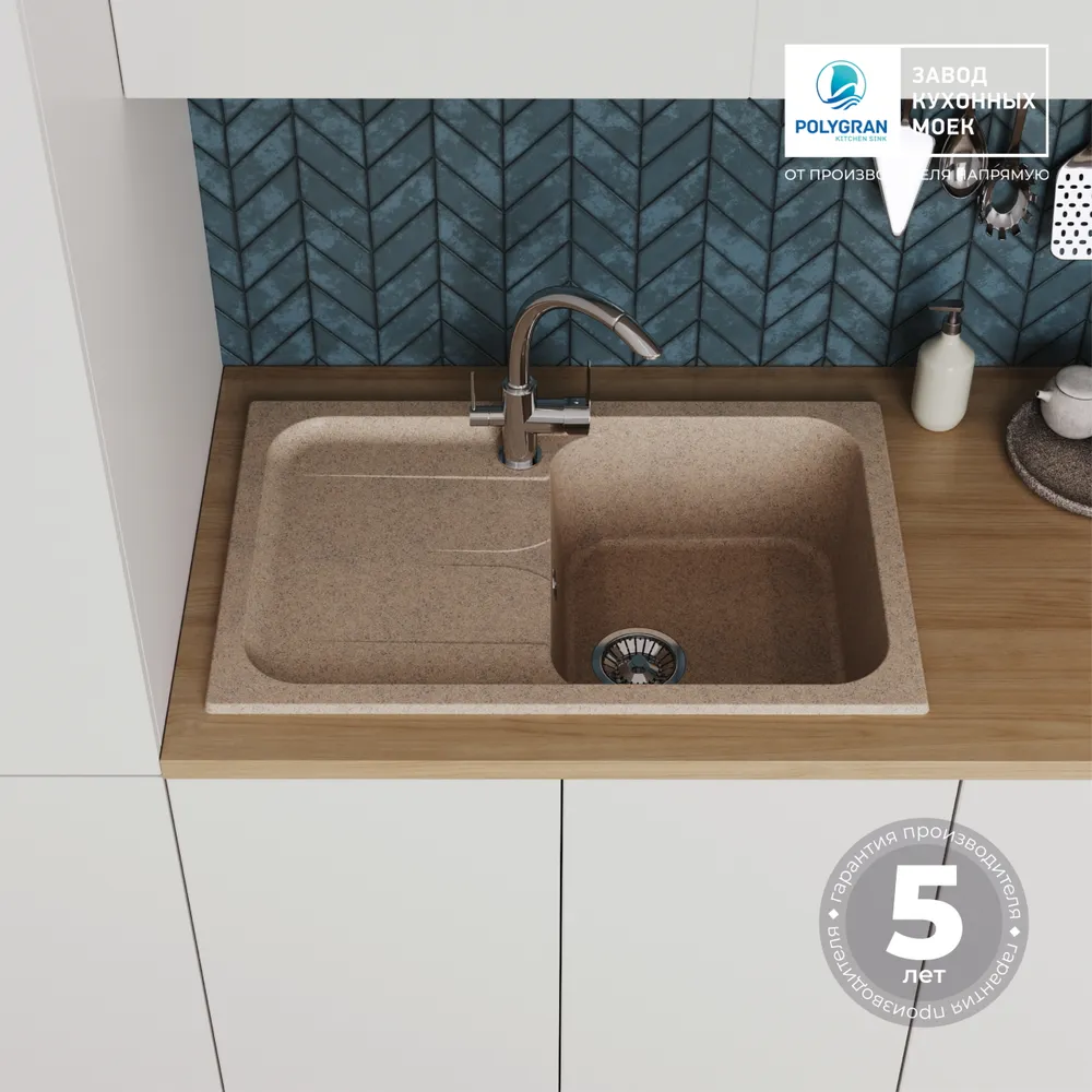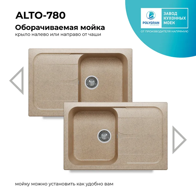 Возможность установки крыла слева или справа. В крыло мойки можно интегрировать кран фильтра для питьевой воды и дозатор моющих средств. Размер выпускного отверстия составляет 3,5″ OKG, что идеально подходит для установки измельчителя пищевых отходов (диспоузера). Не требует крепления к столешнице, благодаря собственному весу. Крепится в посадочное отверстие только на клей-герметик. Сливная арматура моек адаптирована к требованиям российской канализации.