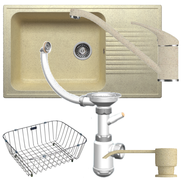 Комплект(5 предметов): мойка, смеситель, дозатор, корзина, сифон.