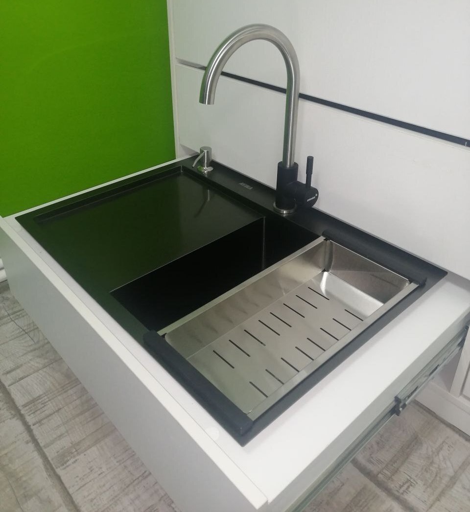 Мойка AVINA 680*480*230 черный сатин R, смеситель KALAMBO черный